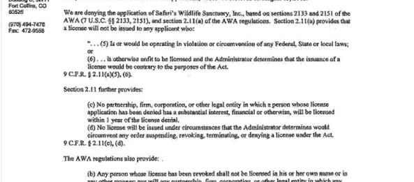 On OCT. 11, 2012: USDA DENIES SAFARI’S BOARD MEMBER APPLICATION FOR NEW USDA LICENSE BECAUSE OWNER LORI ENSIGN-SCROGGINS IS STILL ACTIVELY CONNECTED TO THE PARK