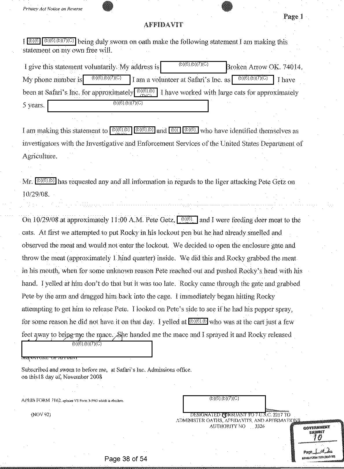 Kurt Beckelman's sworn affidavit JPEG pg 1 of 2 to the USDA re liger attack, testimony given Nov 18, 2008Kurt Beckelman's sworn affidavit JPEG pg 2 of 2 to the USDA re liger attack, testimony given Nov 18, 2008Kurt Beckelman's statements to Wagoner Co. Sheriff on Nov 8, 2008, about liger attack Oct. 29, 2008