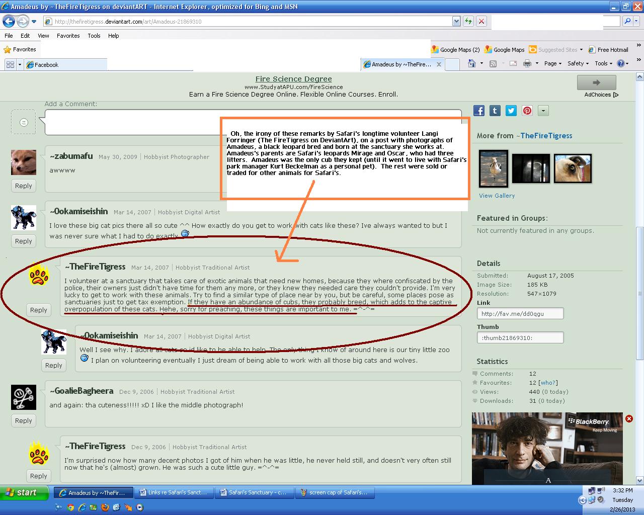 Safari’s owner, Lori Ensign-Scroggins, confirmed in writing this month that staff still do enter some of the big cats’ cages at feeding time but brushes the danger aside by describing those particular cats as “sweethearts,” giving a false sense of security, when the reality is—proven time and time again, there are no guarantees when it comes to undomesticated large carnivorous cats—whether or not a person is familiar with the cat or not. This is an excerpt of what Lori posted on March 9, 2013, to a KJRH news article about Safari’s to raise money and donations, in response to comments posted to the article bringing up serious issues at the park, including how big cats were fed. [Capitalization and punctuation are Lori’s, copied directly from the comment on the article.]